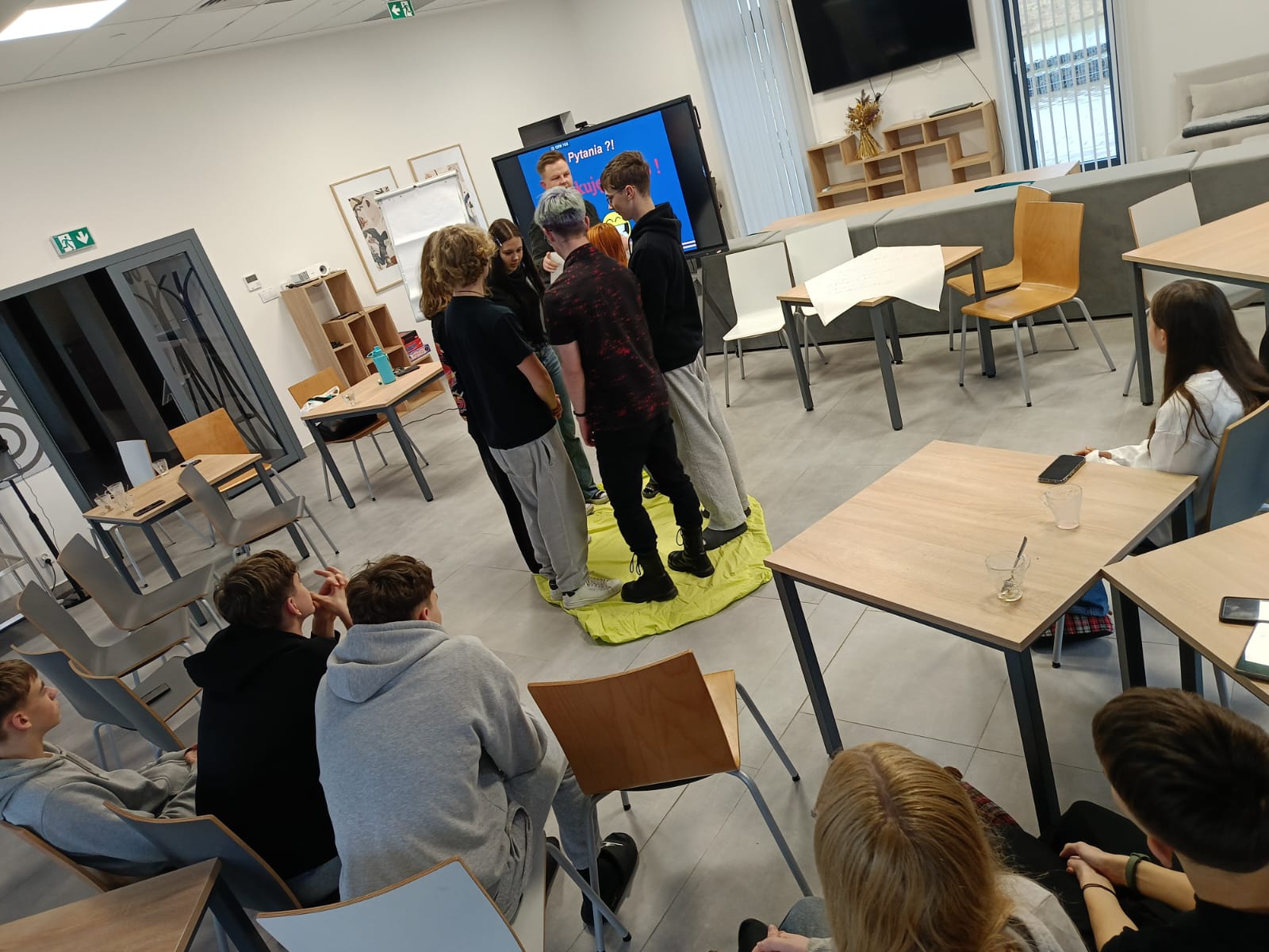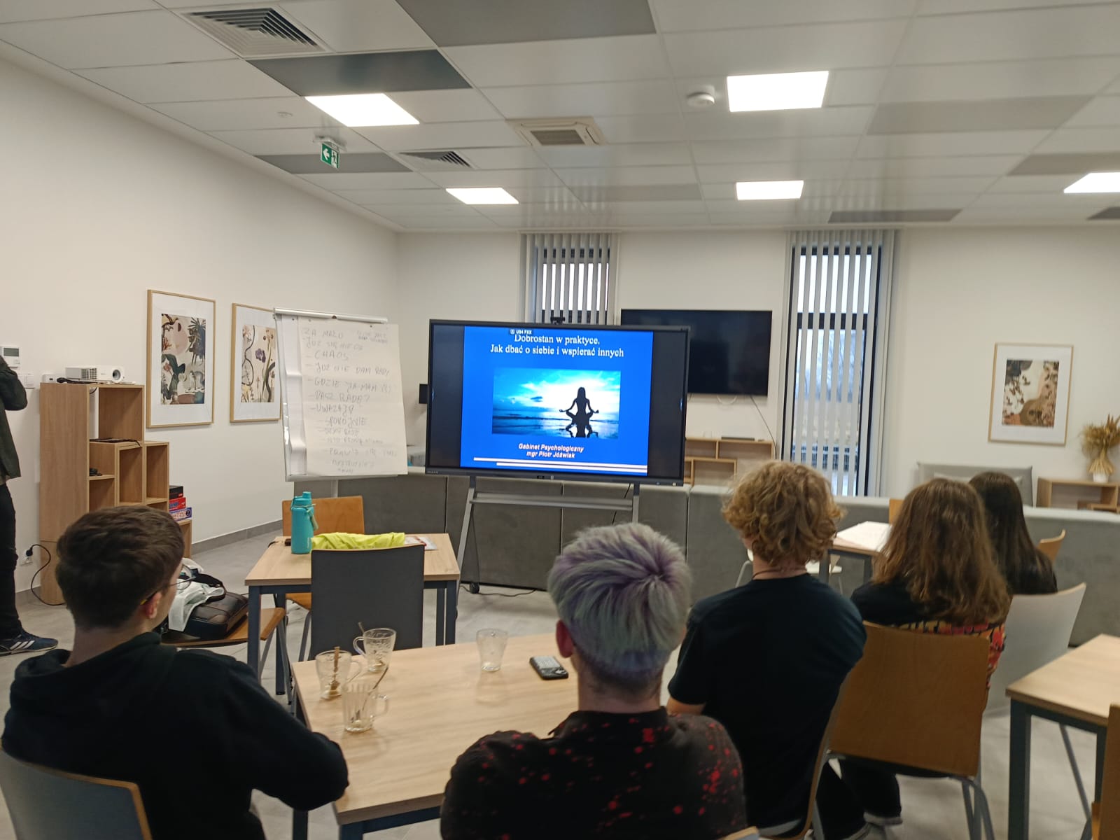 Po zapoznaniu się z trzecią lokalizacją Bursy młodzież wzięła udział w warsztatach z psychologiem, które odbyły się pod hasłem „Dobrostan w praktyce – jak dbać o siebie i wspierać innych”. Podczas spotkania uczestnicy mieli możliwość lepszego poznania siebie, rozwijania umiejętności komunikacyjnych oraz nauki radzenia sobie ze stresem i emocjami.